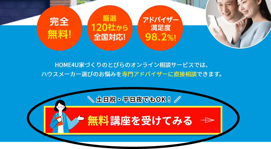 ハウスメーカーで10年以上の営業としての実務経験を持っているプロが、完全に中立の立場から親身になって家づくりの相談に完全無料でのってくれます。