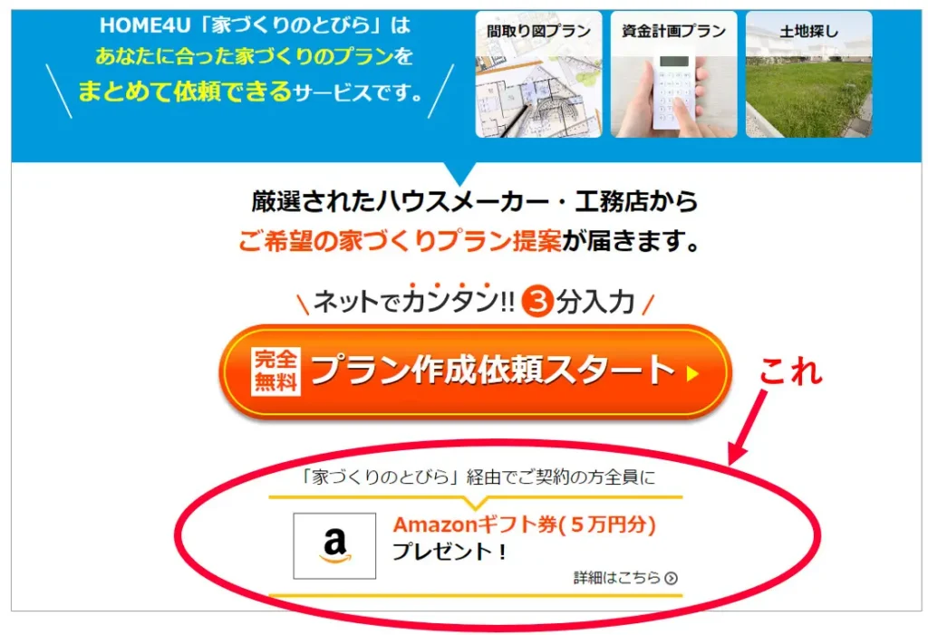 家の相談にしっかりと乗ってくれて、自分に合った建築メーカーまでプロの目で選んでくれて、しかも実際に建築したらAmazonギフト券5万円プレゼントしてもらえるという。